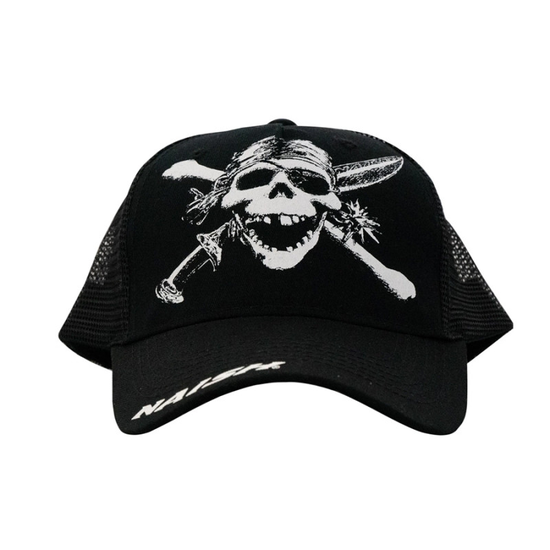 Iconic Naish pirate logo (illustrated by Robby Naish himself) printed on a black trucker hat